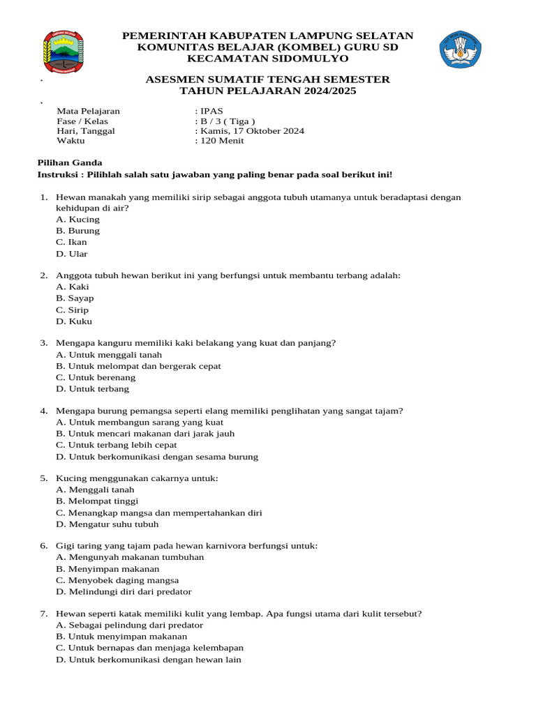 Mempersiapkan diri untuk ujian tengah semester (PTS) adalah hal penting yang harus dilakukan oleh siswa. Salah satu cara terbaik untuk mempersiapkan diri adalah dengan berlatih mengerjakan soal-soal latihan. Berikut ini adalah kumpulan soal PTS Ilmu Pengetahuan Alam (IPA) Kelas 3 SD Semester 1 Tahun 2025, lengkap dengan kunci jawaban.